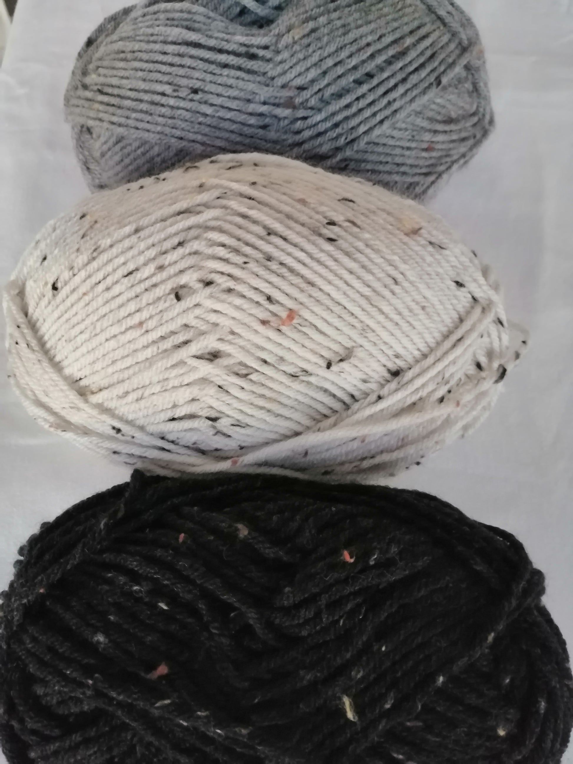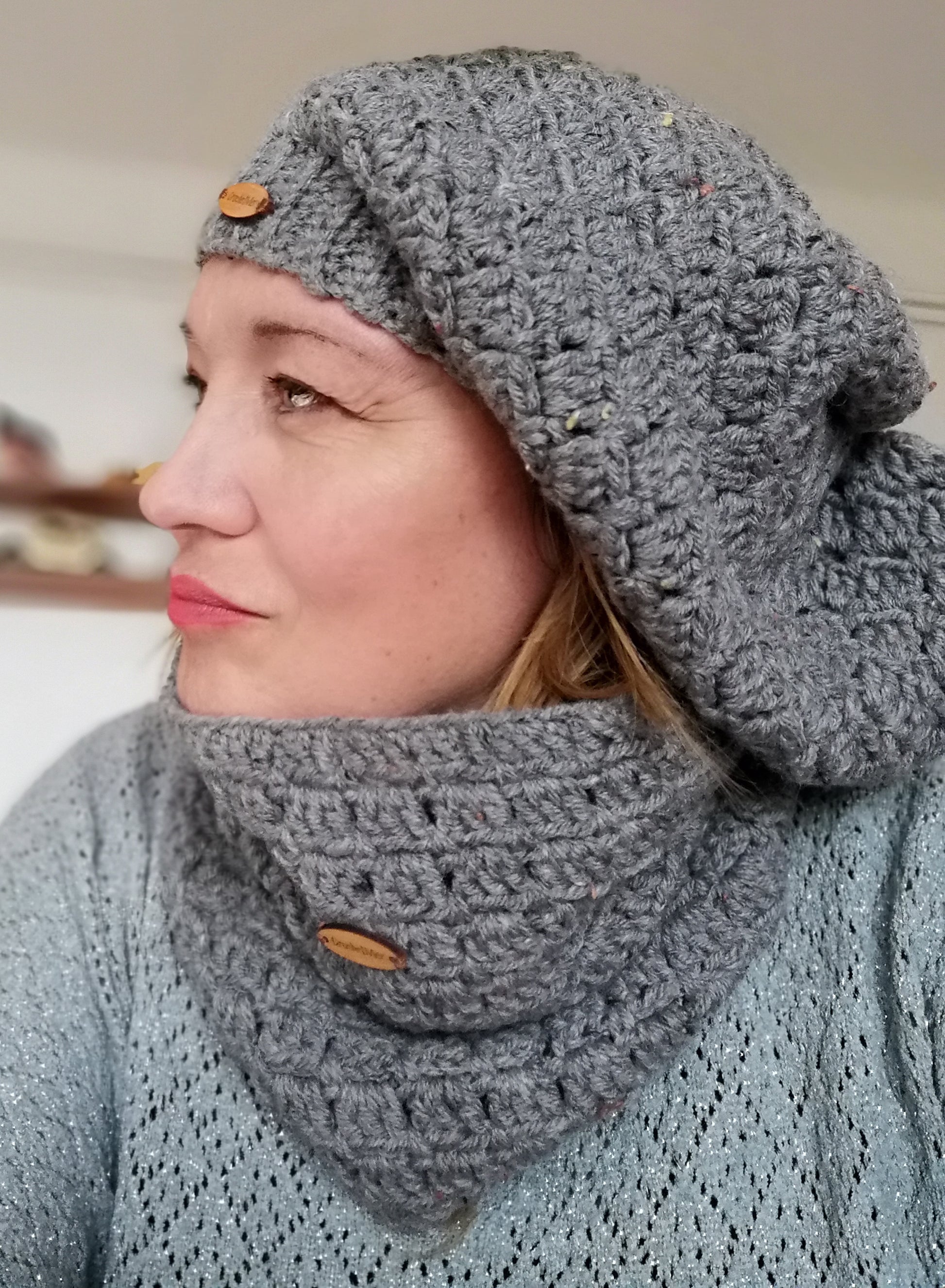 Produto em promoção: cor efeito tweed cinza sem pompom. Com 1 etiqueta de madeira CrochetMer e 1 etiqueta de imitação de couro feita à mão.